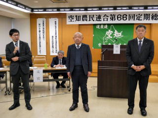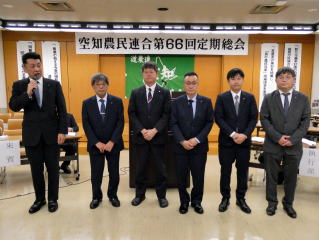 空知農民連合では2月9日、岩見沢市空知農業会館において第66回定期総会を開催した。総会には、管内20市町組織の代議員72名と、来賓18名、執行役員とあわせて120名が出席した。